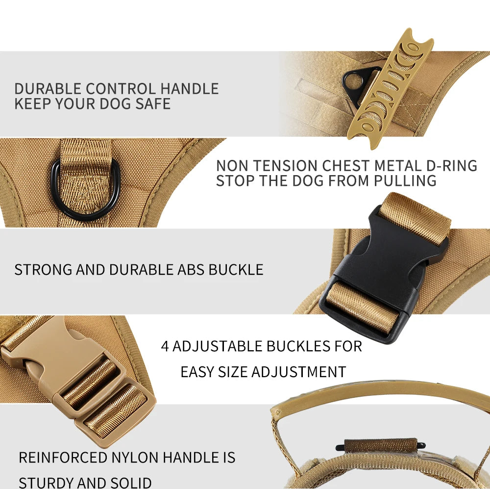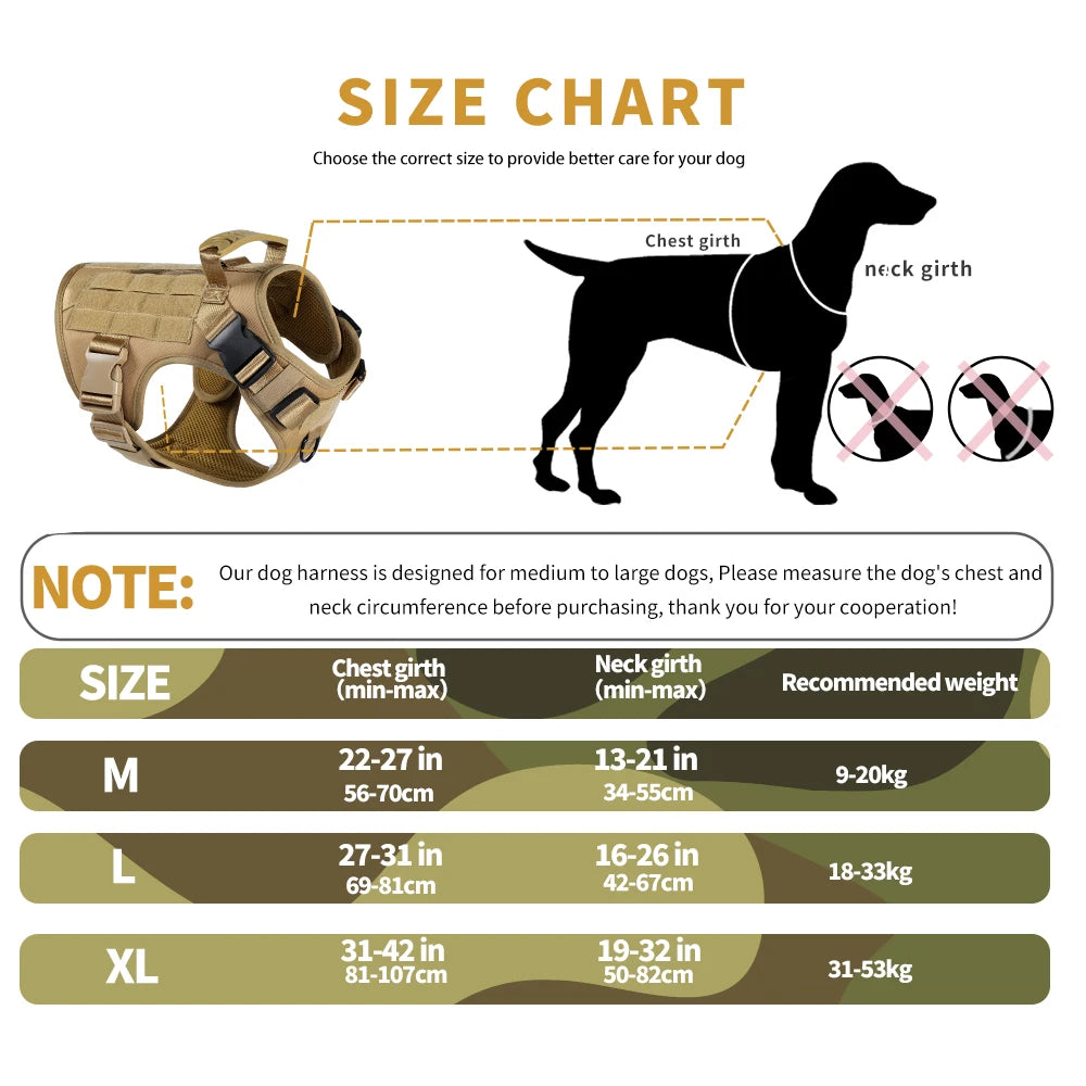 Notre harnais tactique est conçu pour les moyennes et grandes races. Disponible en tailles M, L et XL, il s'adapte parfaitement aux chiens de 10 à 50 kg. Consultez notre guide des tailles pour trouver l'ajustement idéal.